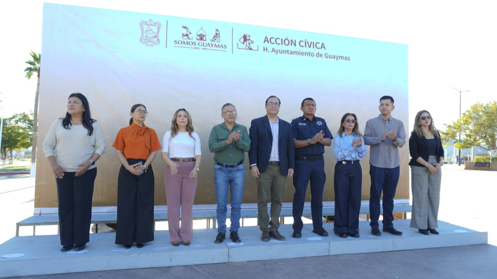 Guaymas, Sonora, 2 de marzo de 2026.- Esta mañana, el Ayuntamiento de Guaymas a través de la Dirección de Acción Cívica, llevó a cabo la ceremonia de izamiento de bandera en la Plaza Tres Presidentes, con la participación de la escolta del Departamento de Policía y Tránsito Municipal.