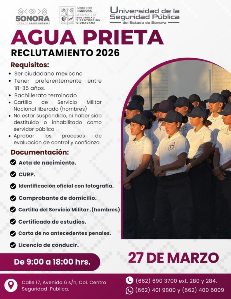 Hermosillo, Sonora; 25 de marzo de 2026.- Con el propósito de integrar a mujeres y hombres interesados en formarse como Policía de Proximidad, la Universidad de la Seguridad Pública (USP) lanza convocatoria dirigida a todos los jóvenes del estado.