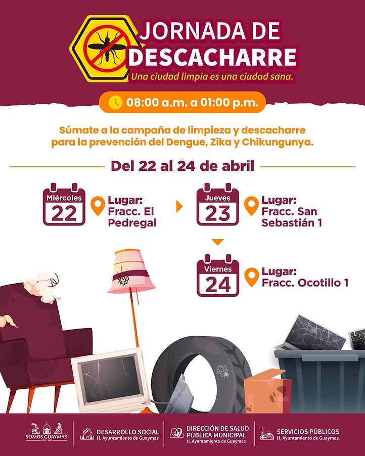 Guaymas, Sonora, 20 de abril de 2026.- A limpiar, retirar de los patios cualquier artículo que pueda servir de criadero de mosco y participar en la Jornada de descacharre, exhorta el Ayuntamiento de Guaymas a las familias de las colonias Pedregal, San Sebastián I y Ocotillo I, anunció Austria Castro Gracia.