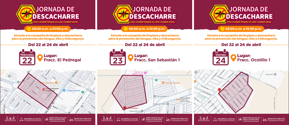 Esta actividad con la que se busca prevenir casos de dengue, zika y chikungunya, iniciando este 22 de abril en sector Pedregal, el día 23 de abril en San Sebastián I y el viernes 24 en Ocotillo I, esto en horario de 8:00 a.m. a 13:00 p.m. y se contará con la colaboración de Desarrollo Social y Servicios Públicos.
